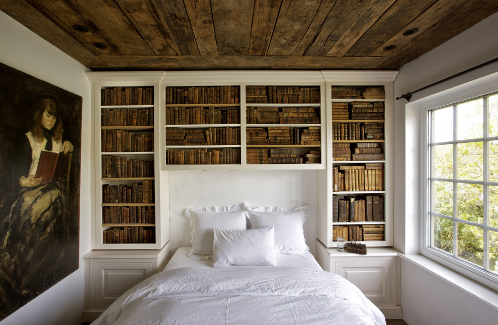 Jeśli kochacie czytać książki przed snem lub po prostu czytać na swoim łóżku to na pewno sprawdzi Wam się biblioteka w sypialni. Ciekawym pomysłem będzie zrobienie miejsca na książki za łóżkiem. Zamiast obrazu można zrobić kilka półek na ulubione książki. Jest to wygodne rozwiązanie, ponieważ każda książka będzie w zasięgu ręki bez schodzenia z łóżka. Można również pomyśleć o narożnych regałach, które idealnie wpasują się do wnętrza.