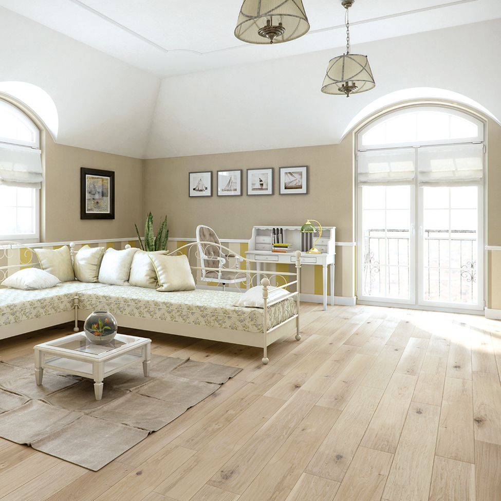 Jasna podłoga jest idealnym tłem dla aranżacji wnętrz. Sprawia, że wnętrze staje się bardziej rozjaśnione i optycznie poszerzone. Nadaje się do każdego pomieszczenia. Do sypialni sprawdzi się biała podłoga, a do salonu czy kuchni piaskowa. Pięknie łączy się z betonem i cegiełkami, dlatego tak często możemy ją spotkać we wnętrzach robionych w stylu skandynawskim, vintage i industrialnym. Również dobrze wygląda w stylu chic, shabby, boho czy prowansalskim. Jasna podłoga jest w skrócie uniwersalna i pozwala na jakiekolwiek zmiany wystroju wnętrz bez problemu związanego z niedopasowaniem.