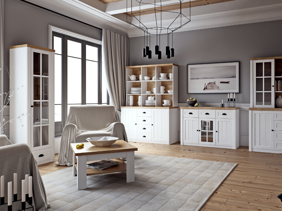 W pomieszczeniach robionych w stylu prowansalskim najczęściej występują białe, drewniane meble oraz dodatki z wikliny. W takich wnętrzach również są używane takie barwy jak: jasny błękit, lawendowy, beżowy lub biały. Dzięki wykorzystaniu takich jasnych kolorów i białych, kremowych mebli wnętrze staje się optycznie większe i sprawia wrażenie czystego, a przy tym przytulnego. Dlatego jeśli nasz salon jest niewielkich rozmiarów to zrobienie go w tym oto stylu będzie świetnym pomysłem. Warto postawić na meble, które sprawiają wrażenie lekkich, aby nie przytłaczały wnętrza. Takimi elementami w meblach, które nadają takiego delikatnego efektu, to m.in. uchwyty o lekko wypukłym kształcie czy miękko wymodelowane nóżki. Dodatkowo otwarte półki i szafki ze szklanymi witrynami nadają lekkości pomieszczeniu. Jeśli salon w samej bieli Cię nie przekonuje i chcesz trochę bardziej poeksperymentować to możesz dodać trochę akcentu kolorystycznego, w postaci ciekawych dodatków w beżowym, żółtym lub lawendowym odcieniu. Takie barwy nawiązują do ciepłej Francji i pól lawendy.
