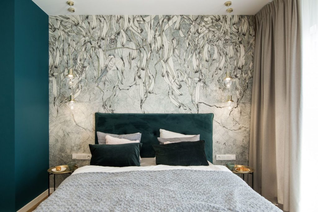 Jeśli chodzi o wzór naszej tapety do sypialni to świetnie sprawdzi się z motywem roślinnym, np. duże liście lub kwiaty bądź w stylu art deco.